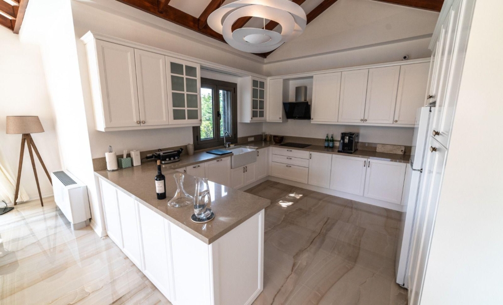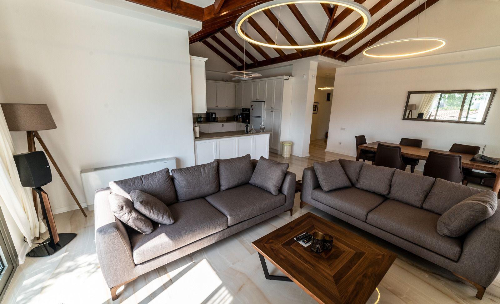 Built with modern living in mind, the villa’s open-plan layout creates a sense of flow, space, and light. The living area features a high vaulted ceiling that enhances the airy atmosphere and connects beautifully with the outdoor spaces through floor-to-ceiling glass doors.