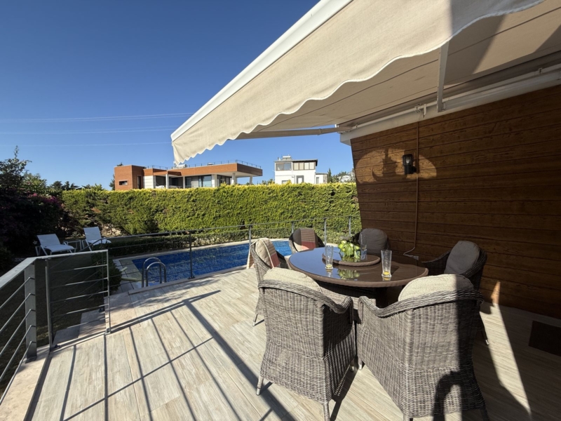 This property captures the spirit of Mediterranean outdoor living. The private swimming pool forms the centerpiece of the garden, surrounded by multiple lounge and sunbathing areas — ideal for relaxing, hosting friends, or enjoying meals under the Bodrum sky.