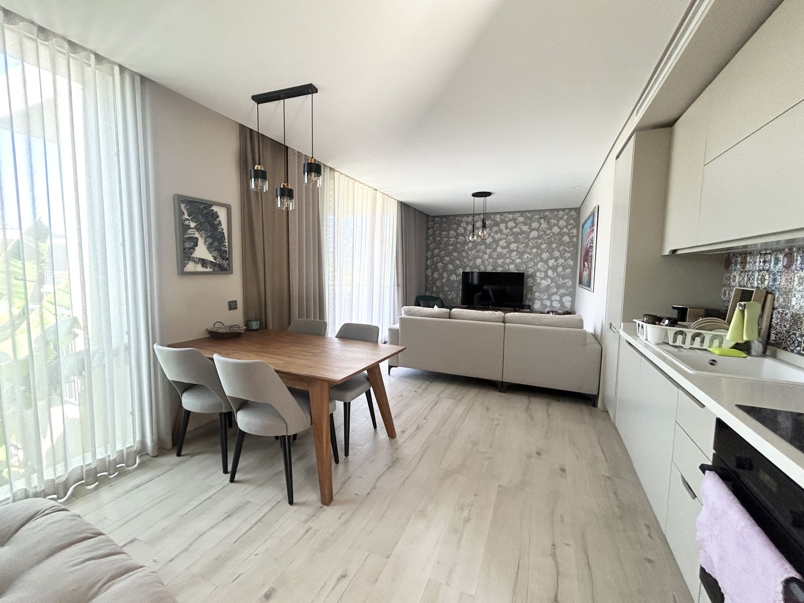 The apartment features a spacious open-plan layout that integrates the living area and fully equipped kitchen, creating a bright and airy ambiance. Large windows and glass doors open to a balcony and generous terrace, extending your living space outdoors—perfect for enjoying morning coffee or evening sunsets over the town’s scenic backdrop.The bedroom is designed for comfort and tranquility, while the modern bathroom features premium fixtures and contemporary finishes. Fully furnished with tasteful décor and quality furniture, the apartment is ready to move in, making it a convenient option for buyers seeking a turnkey property.Smart Living Features