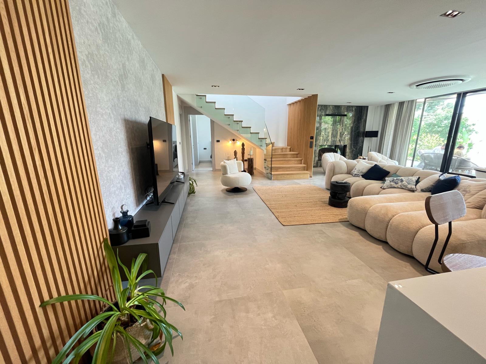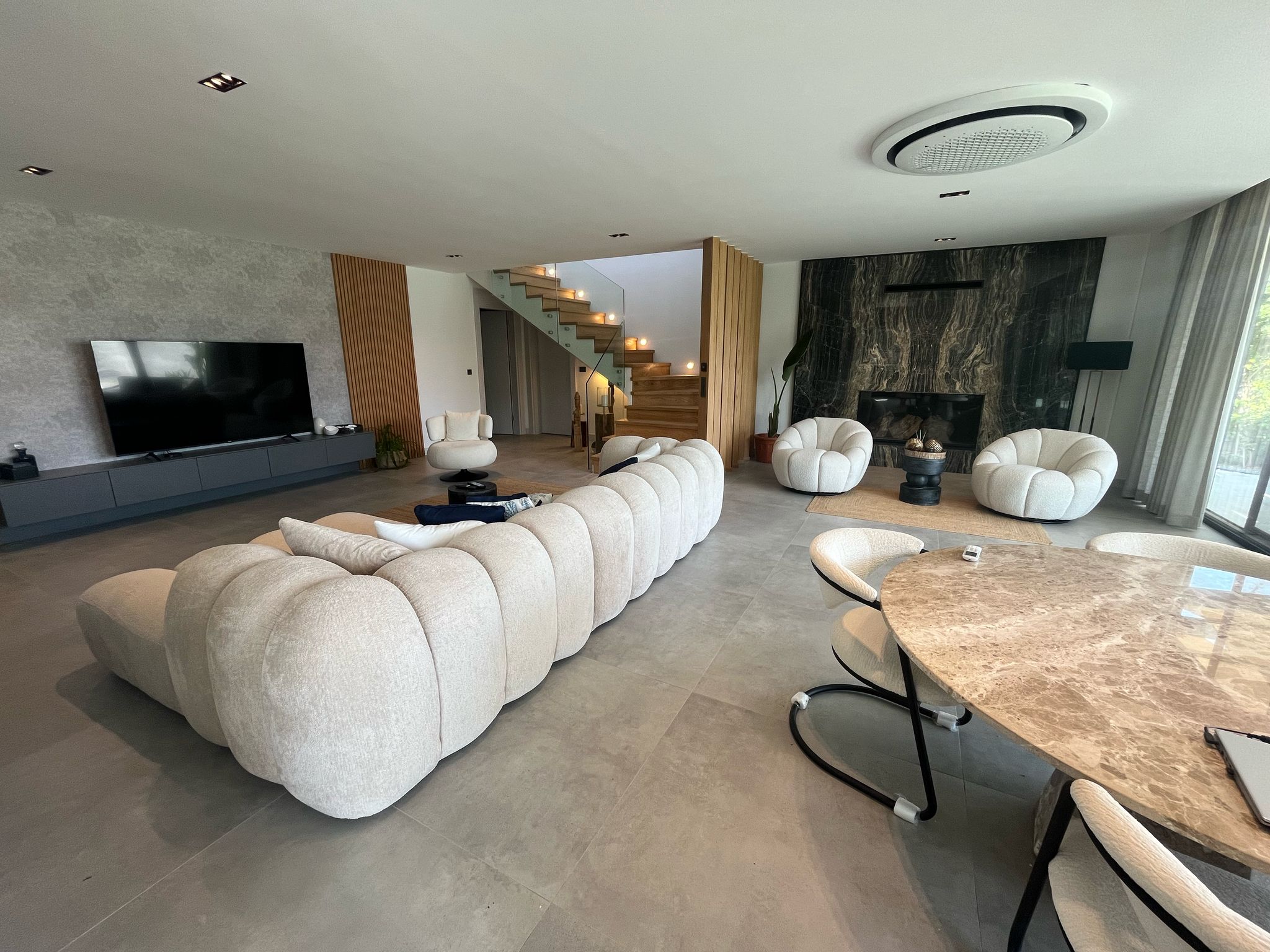 Set on a 600 m² private plot, the villa features 220 m² of indoor living space, seamlessly blending elegance with functionality. The open-plan layout invites abundant natural light through floor-to-ceiling windows, connecting the spacious living and dining area to the private garden and pool terrace.