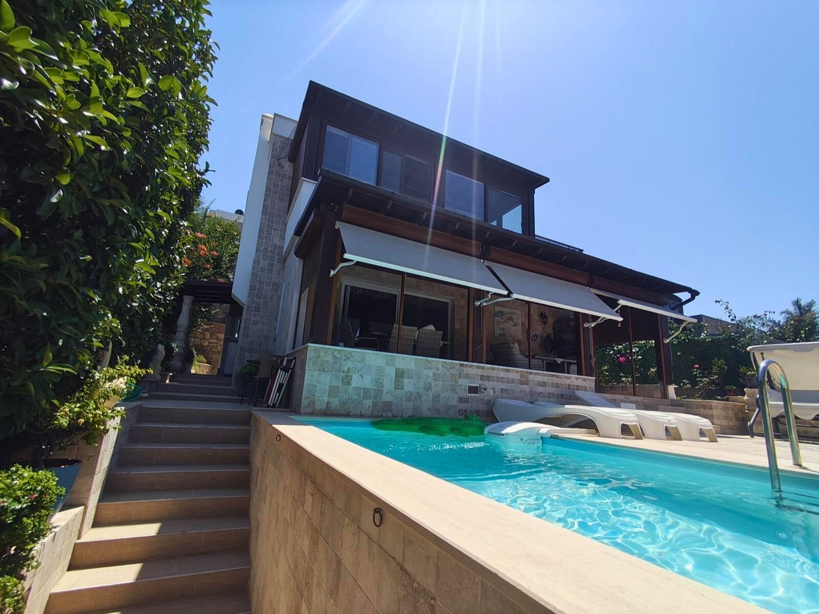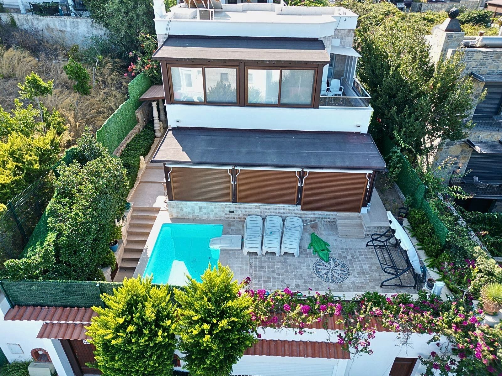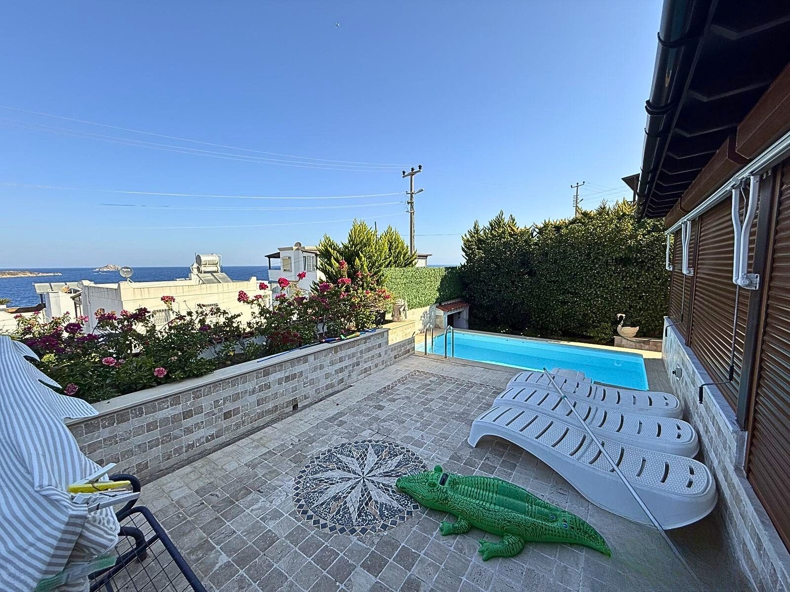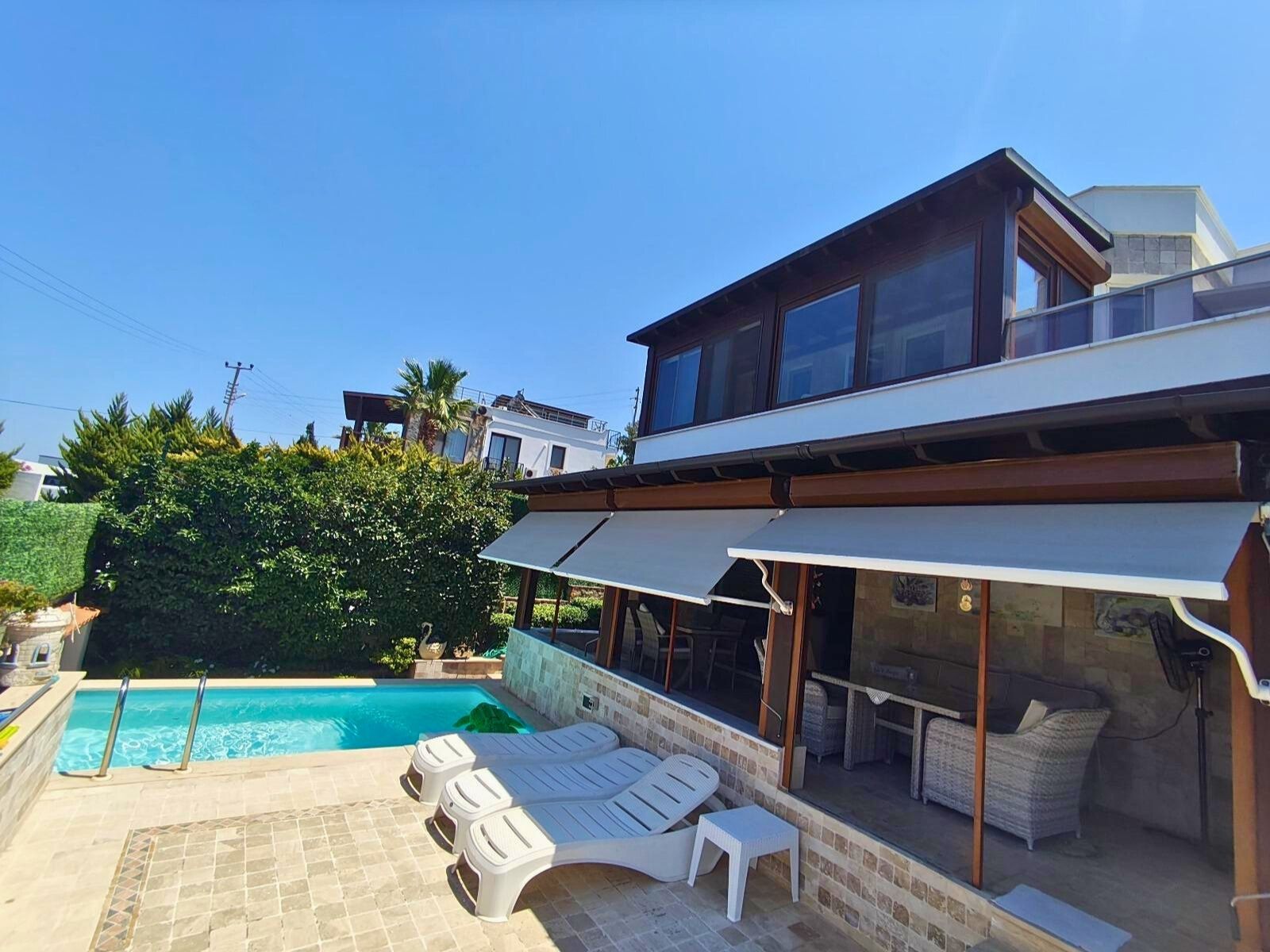 Upstairs, residents can enjoy three private balconies—two open and one enclosed—each designed to make the most of the sweeping views and gentle sea breezes. Whether used as tranquil reading corners or outdoor lounges, these spaces bring the beauty of Tilkicik into daily life.The private pool serves as the centerpiece of the garden, surrounded by ample terrace space for sunbathing and dining al fresco. This outdoor area is perfect for both peaceful mornings and lively summer gatherings, offering an effortless blend of relaxation and entertainment.