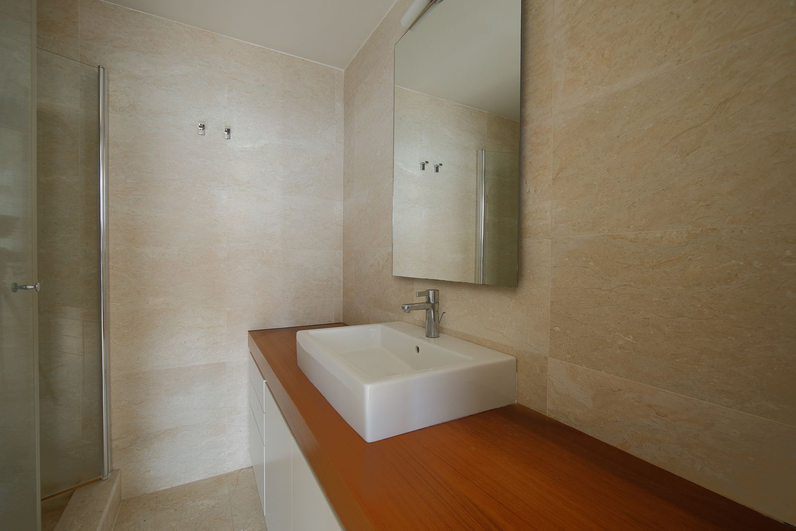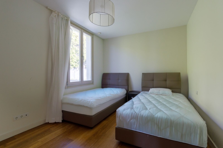 The apartment’s interior reflects sophisticated minimalism, featuring a spacious master suite with an en-suite bathroom, two additional bedrooms, and a modern family bathroom designed with premium fixtures and finishes.