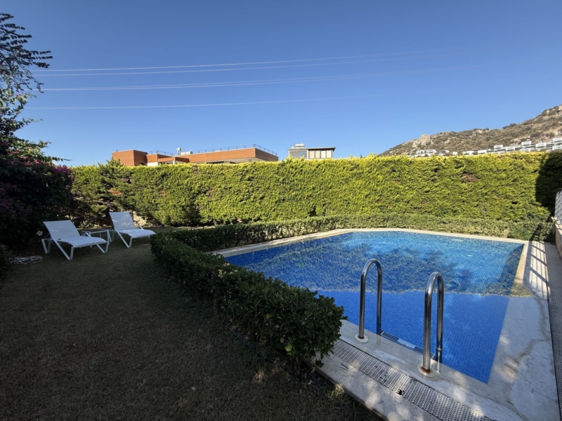 This property captures the spirit of Mediterranean outdoor living. The private swimming pool forms the centerpiece of the garden, surrounded by multiple lounge and sunbathing areas — ideal for relaxing, hosting friends, or enjoying meals under the Bodrum sky.