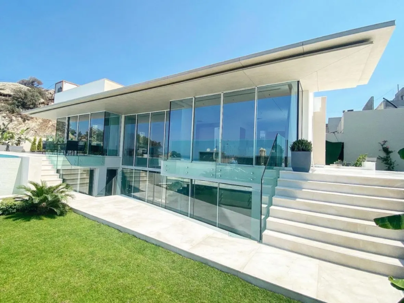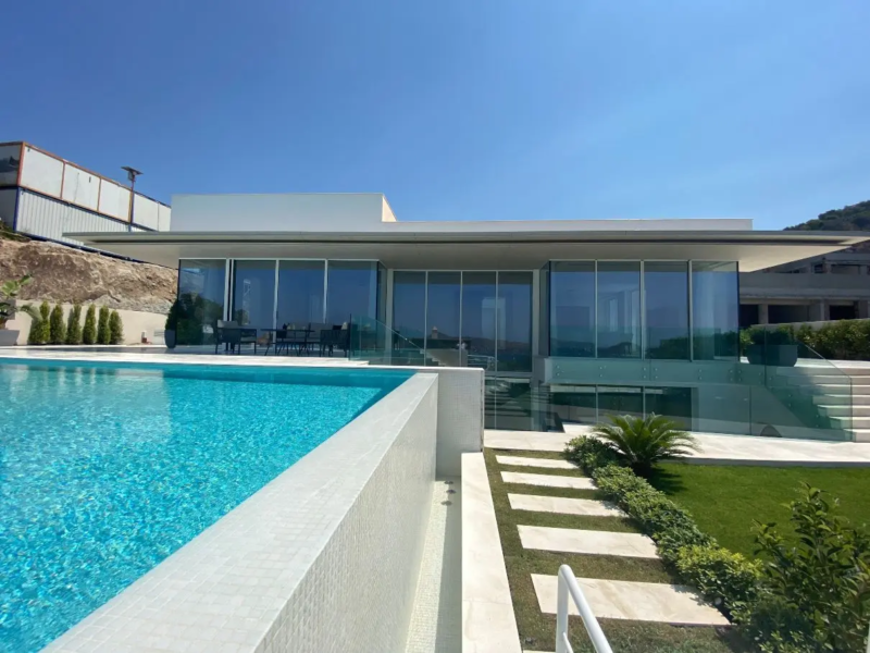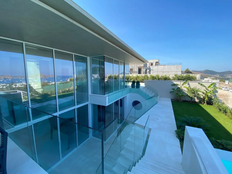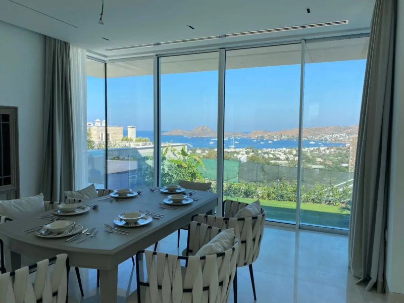 Yüksek tavanlar ve geniş cam pencereler, doğal ışığı içeri alarak panoramik deniz manzaralarını ön plana çıkarır.